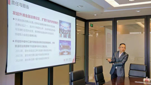 邦信阳中建中汇所主任杜爱武介绍了律所的基本情况、战略定位及近年工作重点亮点。近年来,邦信阳中建中汇所始终坚持“责任与担当”、“创新与引领”。在“责任与担当”方面,邦信阳中建中汇所积极参与营商工作,助力优化营商环境;深入争议解决一线,助力矛盾纠纷化解;服务企业合规经营,助力企业健康发展;积极参政议政,服务法治政府建设;开展系列社会公益项目,积极履行社会责任。在“创新与引领”方面,邦信阳中建中汇所积极探索律所中台建设,提高平台服务能级;探索律所人才制度,改善律师从业条件;探索专业成果转化,支持律师著书立说;探索平台数字化转型,创新法律科技平台。曾荣获全国优秀律师事务所、上海市优秀律师事务所、黄浦区区长质量奖、上海市文明单位、上海市司法行政工作先进集体等称号。