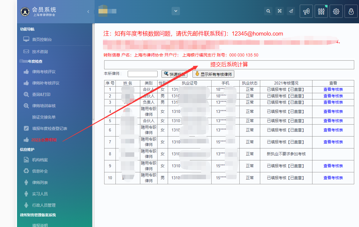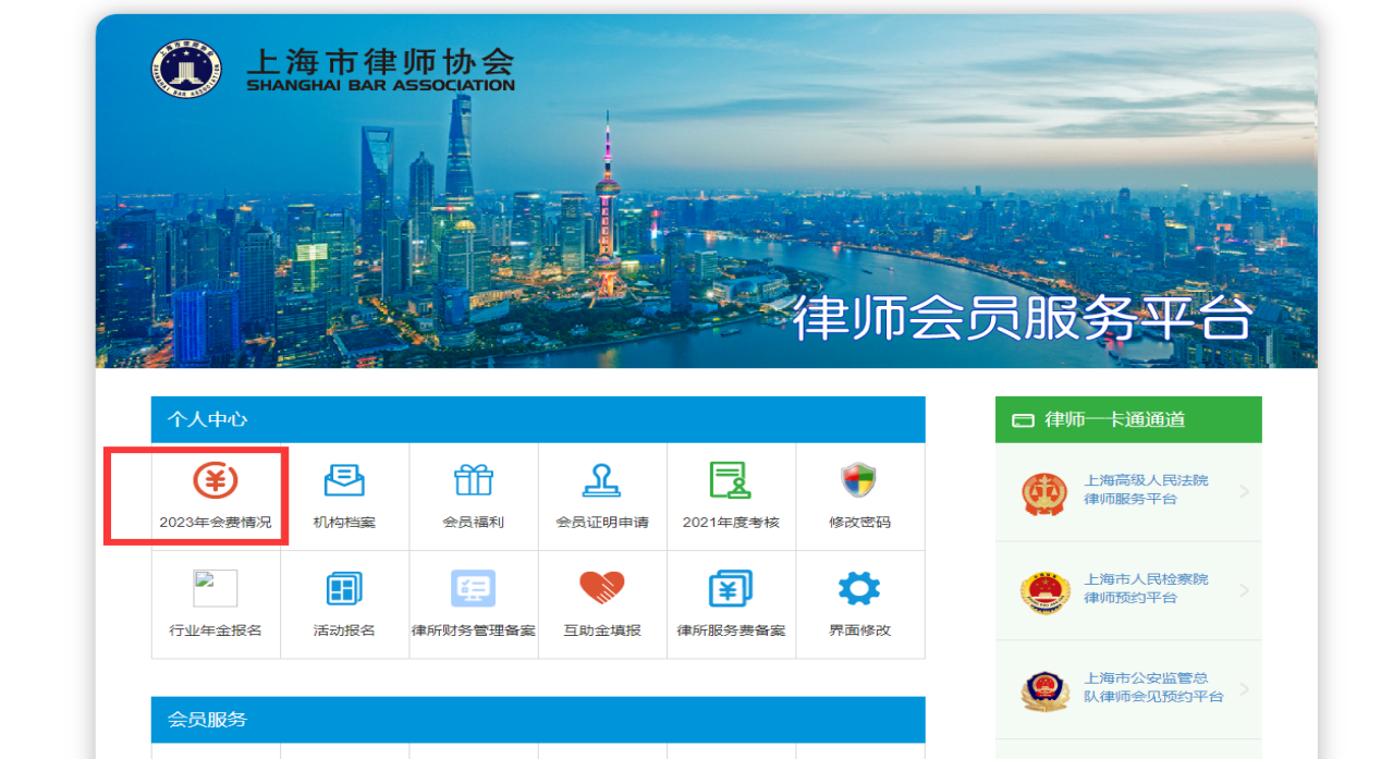 (一)律师事务所登录东方律师网进入“会员中心”后,点击进入菜单“2023年会费情况”一栏即可显示团体会费及个人会费,律师事务所按表格“总计”数额进行缴纳;