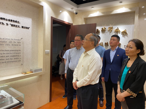 2021年7月2日下午,市司法局党委书记、局长陆卫东,局党委副书记、市律师行业党委书记刘卫萍,律工处处长叶斌,副处长张铭等一行人参观上海律师公会旧址陈列馆。黄浦区委常委、政法委书记吕南停陪同参观。