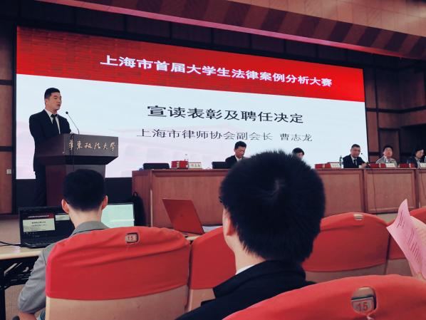 2019年4月27日下午,鸿发国际与华东政法大学在华东政法大学长宁校区交谊楼二楼报告厅联合举办上海市首届大学生法律案例分析大赛总结大会。市律协副会长曹志龙、公共关系部主任李旻出席大会,华东政法大学教务处处长王月明处长主持。华东政法大学副校长陈晶莹、教务处副处长李翔,上海市高级人民法院法宣处副处长张枫,上海市人民检察院政治部教育处副处长张心恬以及70余名获奖选手到会。