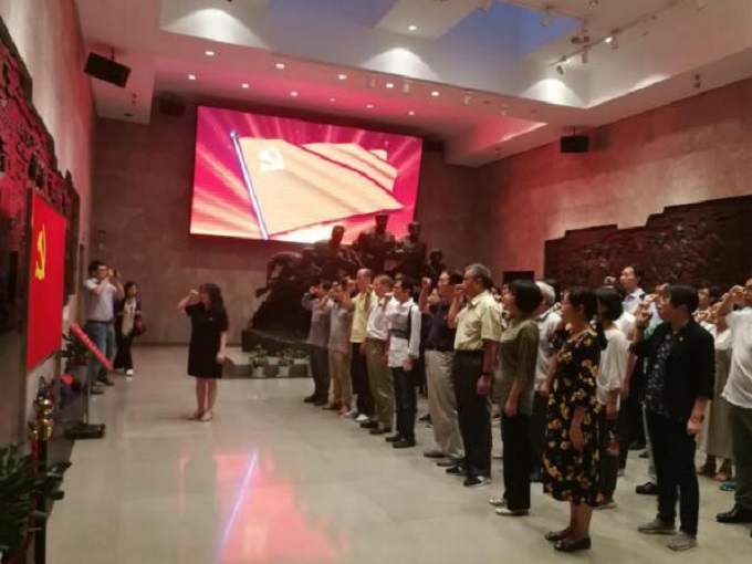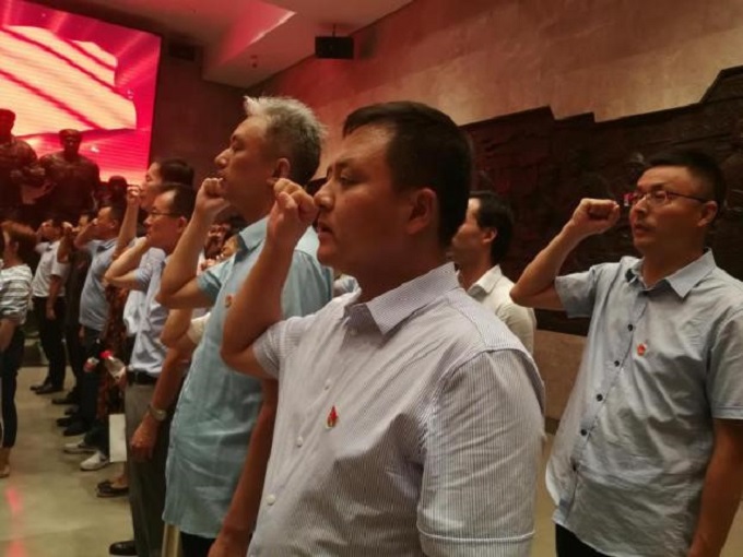 主题活动第三项议程为“重温入党誓词”,面向鲜红的党旗,大家举起右手,庄严宣誓:我志愿加入中国共产党,拥护党的纲领,遵守党的章程…。这庄严的誓言,代表着一名名共产党员的责任和义务。要始终牢记入党誓词,才能不忘使命和初心。