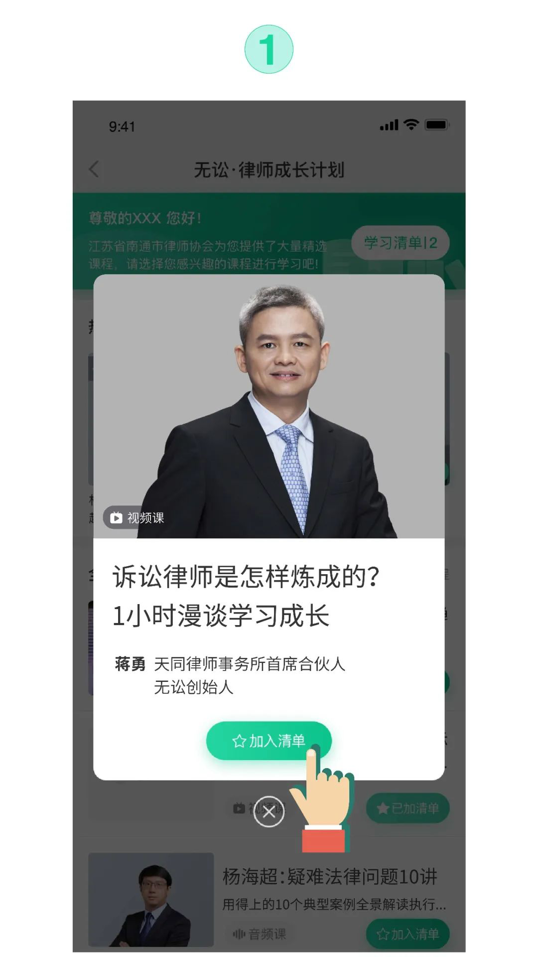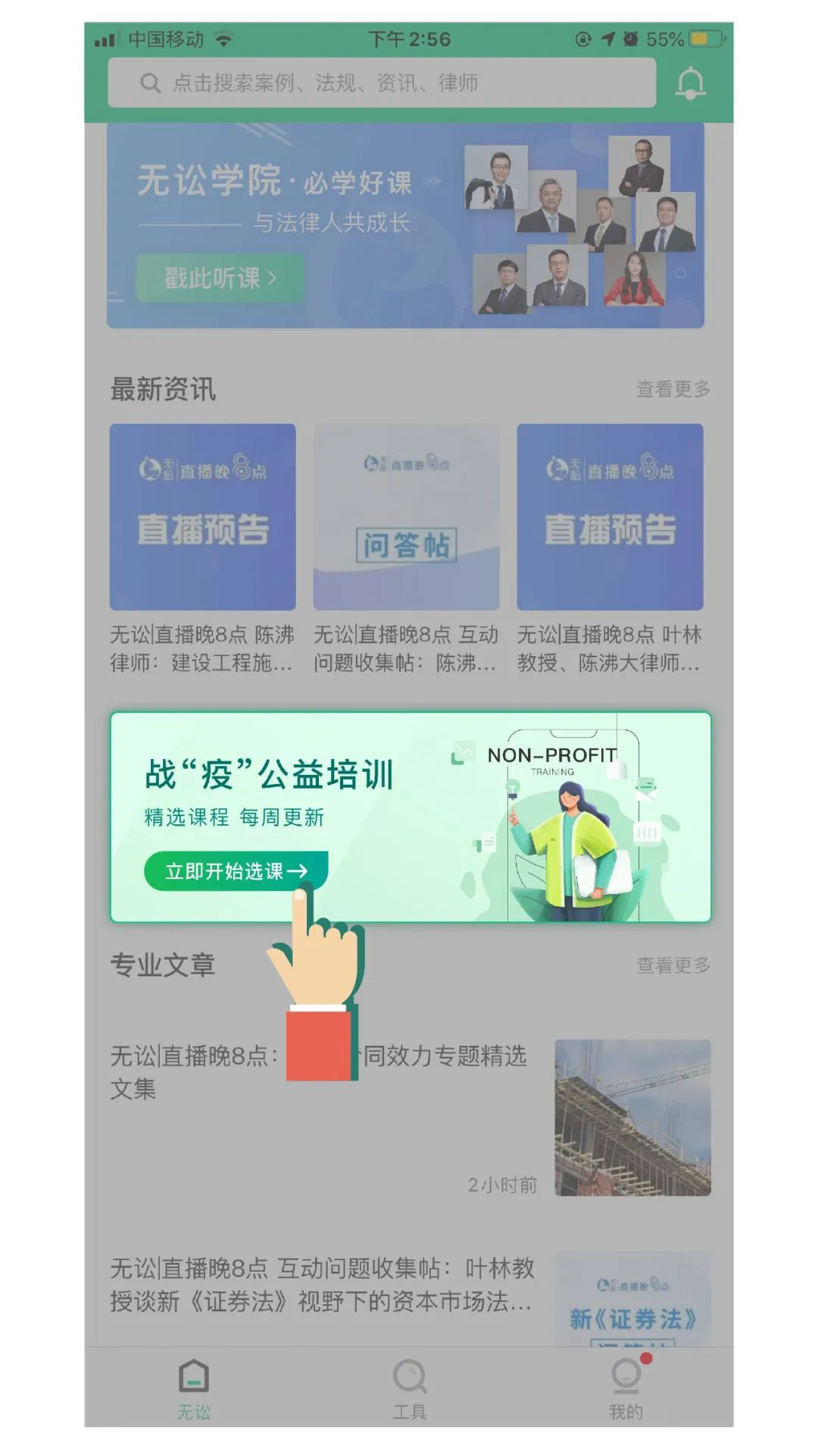 方式2:直播平台“无讼App”首页选课入口图(如04小节图示)