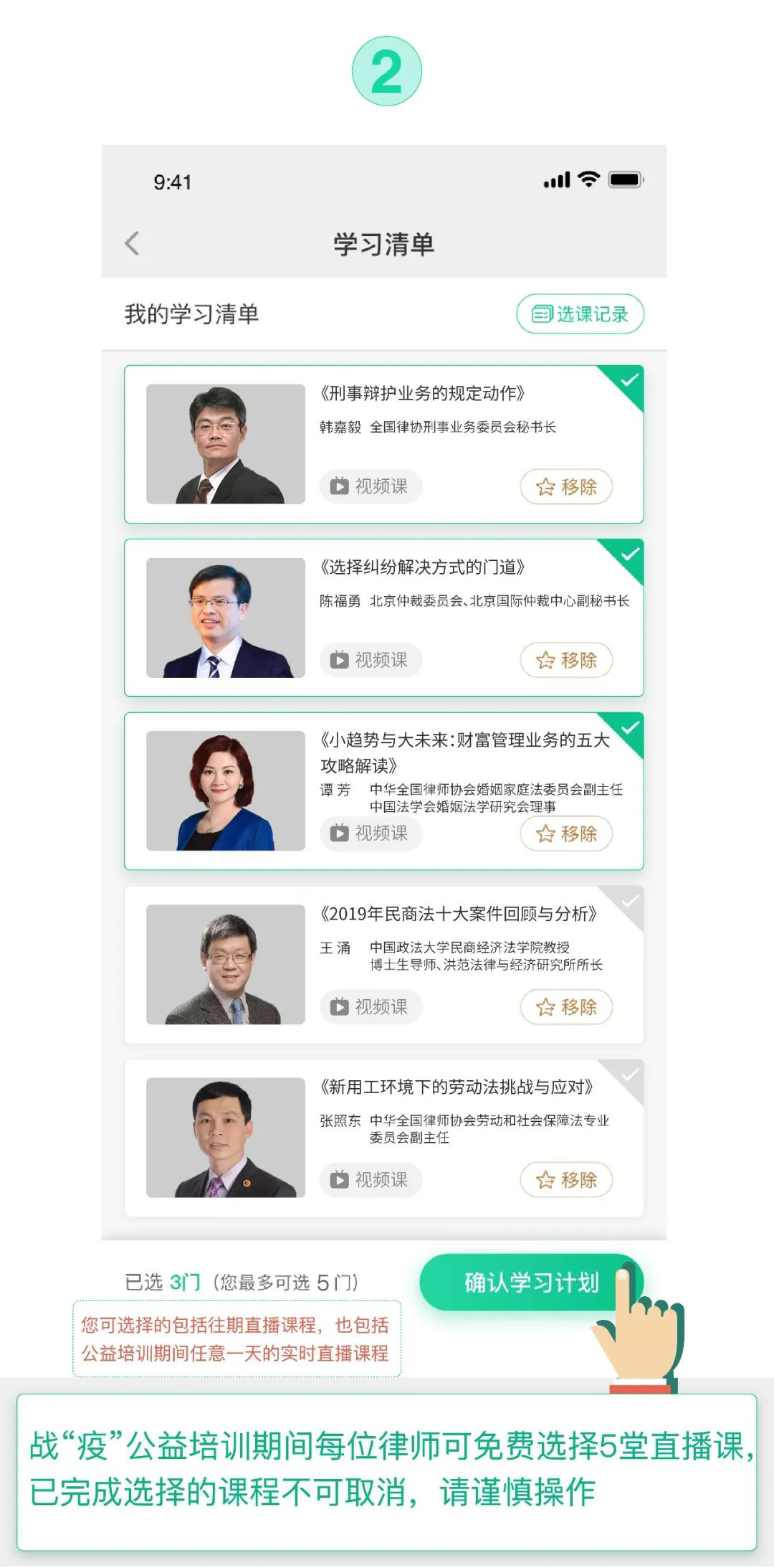 课程周期内,每位报名律师可自行下载“无讼APP”并自主选择5堂课学习。这5堂课是直播平台收费课程,在公益培训周期内对本市律师免费。包含实时直播课程和往期直播课程回看,课程可选范围以《律师战“疫”公益培训课程表》(见附件)为准。每堂课2个小时(含1个小时30分钟的讲授及30分钟互动答疑,具体执行中以讲师的现场控制为准),共计10个课时。为保障良好的学习效果,已经选定的课程在公益培训期间可以反复回看复习。