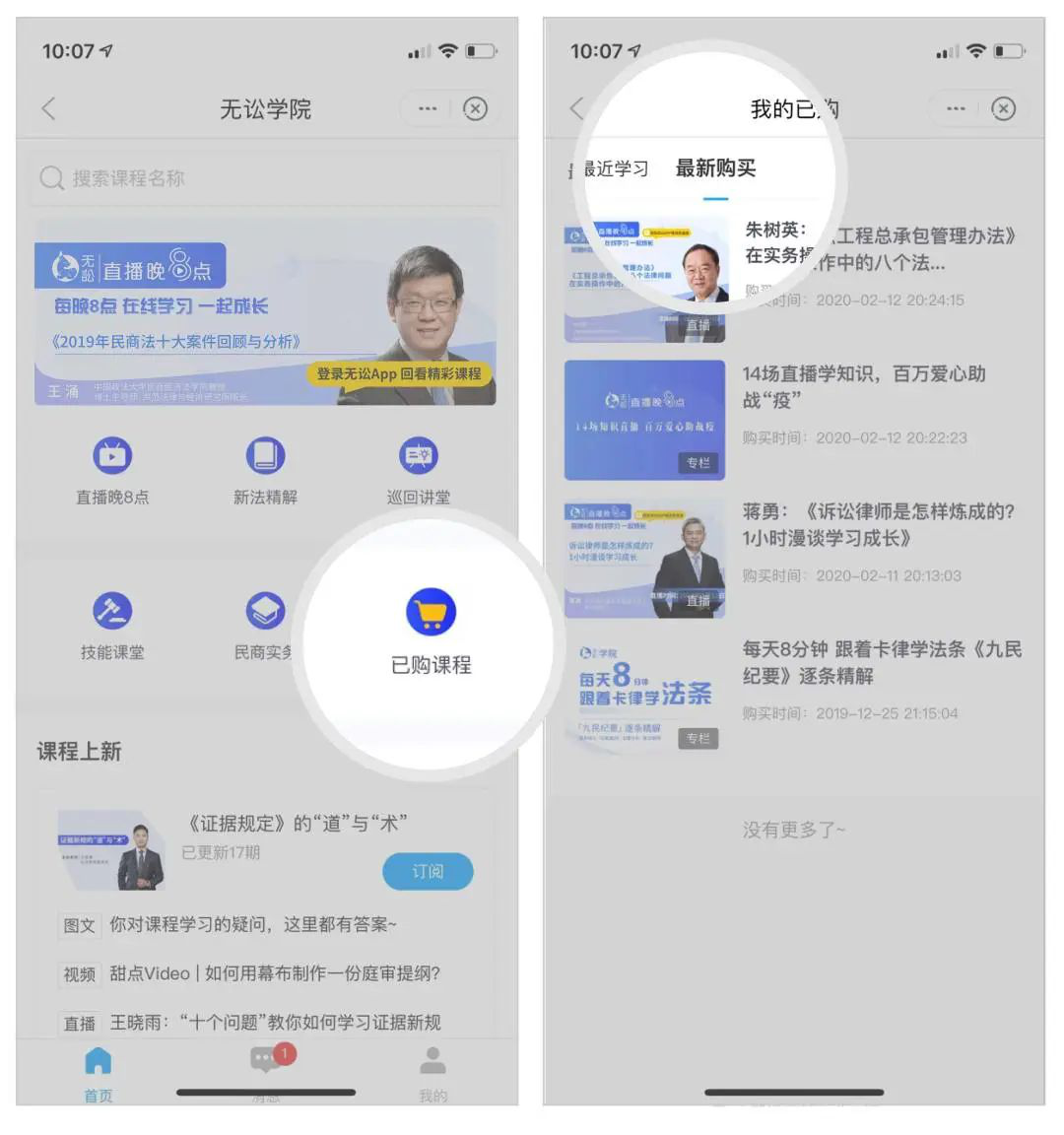4)点击“已购课程” -->最新购买,进入课程开始学习。*您需要先完成选课才能在此处看到已购课程,请参照上面02小节完成选课操作;如果您已是无讼App注册用户,请参照下面04小节完成选课。