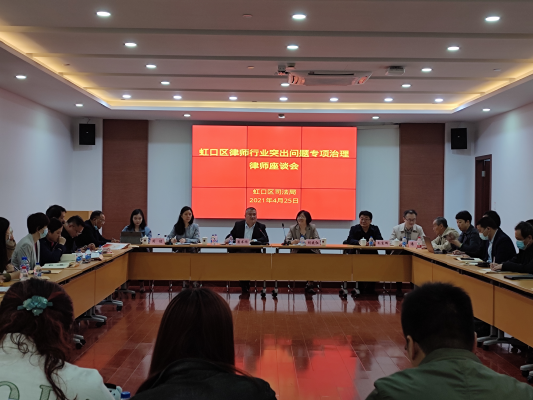 为加强律师行业规范化建设,推动律师行业提高思想认识,不断提升广大律师的政治素质和业务水平。4月25日下午,虹口区司法局召开“虹口区律师行业突出问题专项治理”律师座谈会。市律协副会长、市律师行业突出问题专项治理督导组第八组组长潘书鸿,市律协副秘书长潘瑜及市局律师组朱东辉出席座谈会。座谈会由区律师行业党委书记、副局长胡晓红主持,本区近年来未收到投诉的律师事务所主任、党组织负责人40余人参加座谈会。