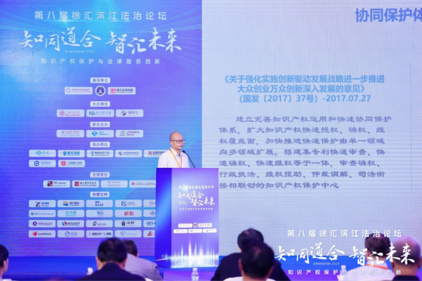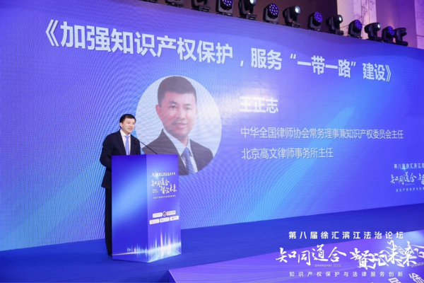 第八届徐汇滨江法治论坛分设主论坛和分论坛。上午的主论坛上,上海交通大学知识产权与竞争法研究院院长孔祥俊,上海市知识产权保护中心副主任徐四立,全国审判业务专家、上海知产法院原专委陈惠珍,中华全国律师协会常务理事兼知识产权委员会主任王正志,上海市政协常委、上海市协力律师事务所创始人游闽键, 君合律师事务所上海分所知识产权部负责人王朝晖 分别以《智能时代的知识产权新挑战》《保护中心协同保护体系助推国际知识产权保护高地建设》《知识产权保护的未来趋势》《知产律师与一带一路》《数字时代知识产权面临的新挑战》《中国专利法第四次修改以及知识产权保护趋势展望》为主题进行了主旨演讲。