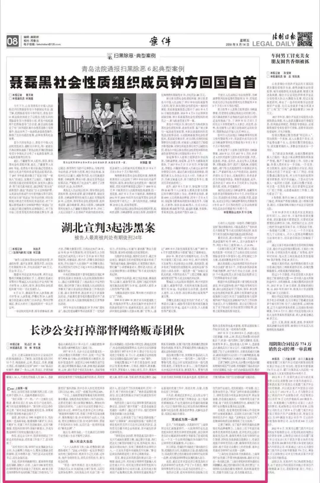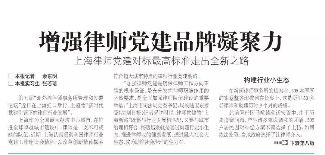 今日(9月14日),《法制日报》在头版报眼刊发《增强律师党建品牌凝聚力》一文,报道律师党建的“上海之路”。
