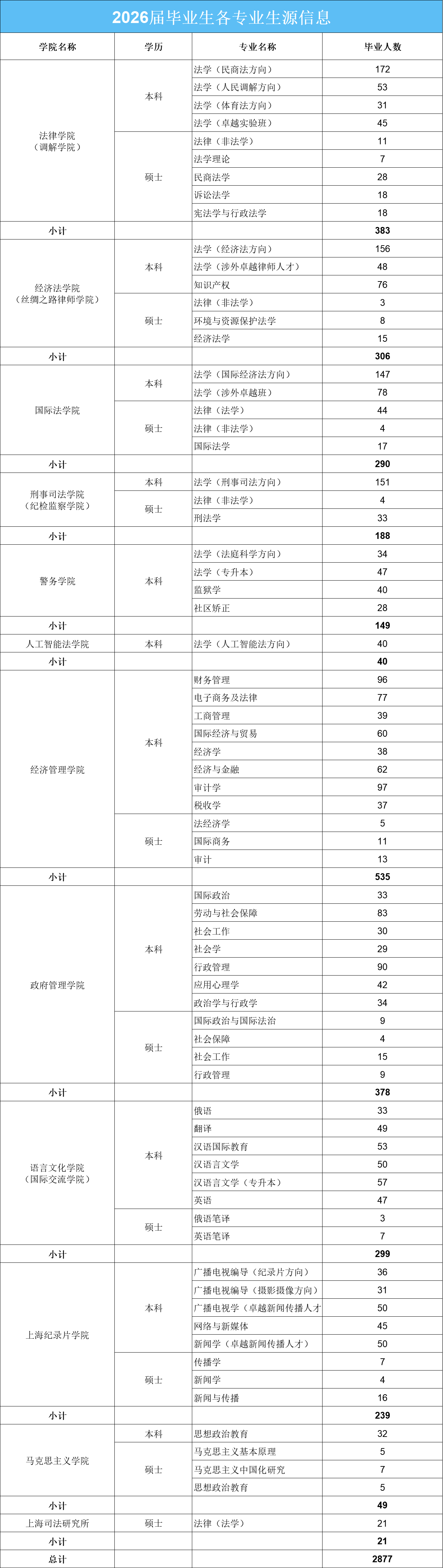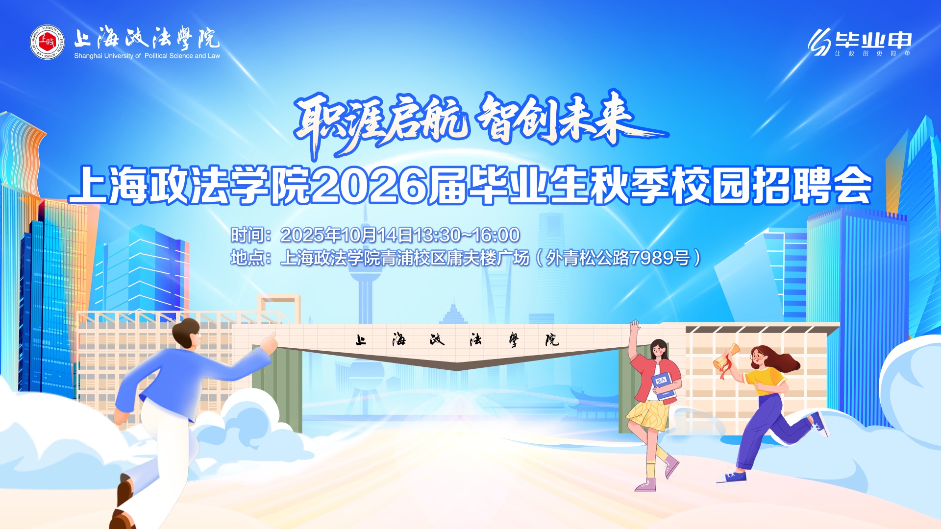 衷心感谢贵单位长期以来对我校毕业生就业工作的悉心关怀与鼎力支持!为落实党中央、国务院关于高校就业工作的决策部署,搭建人才供需对接桥梁,促进毕业生高质量充分就业,上海政法学院兹定于2025年10月14日(星期二)举办“职涯启航·智创未来”2026届毕业生秋季校园招聘会,诚邀各用人单位莅临我校广纳贤才!