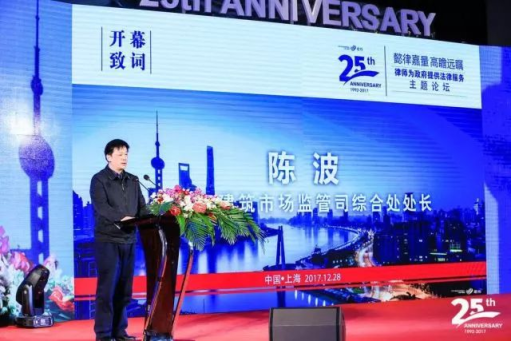 住建部建筑市场监管司综合处处长陈波在致辞中表示,近年来建纬所为市场监管司提供了大量优秀的法律服务,肩负了多项研究工作,并代理了多次成功的诉讼。陈波处长特别指出,目前建筑业相关法律法规依然不完善,需要进一步加强立法工作,依法行政。希望建纬所继续发挥专业优势,为政府继续做好法律服务。