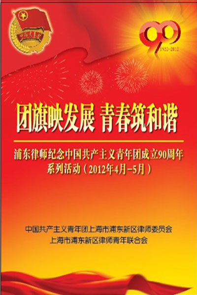 为纪念中国共产主义青年团成立90周年,经浦东新区律师党委同意,浦东律师团委、浦东律师青联将于2012年4月—5月联合举办以“团旗映发展、青春筑和谐”为主题的系列纪念活动,包括公益法律咨询、青年律师篮球赛、主题征文暨优秀团员评选、红色藏品展等,并将在五四青年节召开浦东律师一届二次团代会。