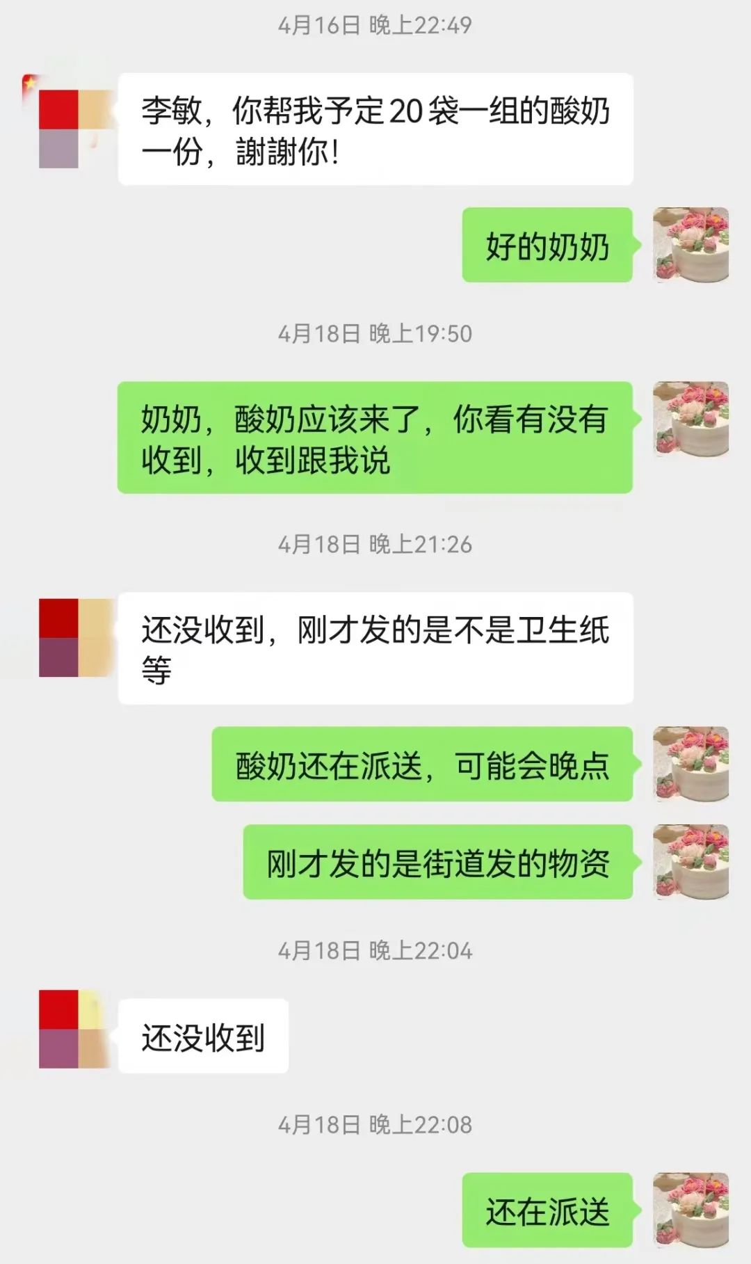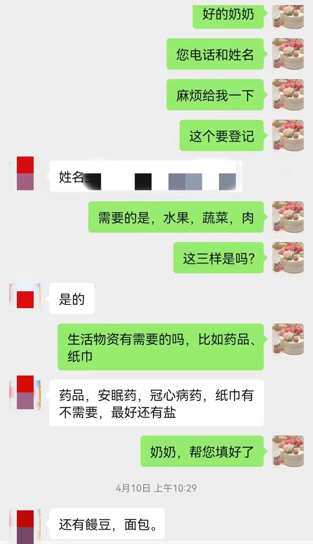 这段时间,团购成了大家购买生活必需品的主要途径。然而,有一些老人不会使用团购功能,甚至不会使用智能手机。每当这时,热心的志愿者们则会上门帮助其完成手机操作,或者了解其意愿后,以个人名义帮助其购买。更令我感动的是,疫情刚开始时,小区有一户老人由于储备物资耗尽,考虑到家中仍有一名幼童的饮食需要保障,因此向居民们发出求救。一时间有数十户居民纷纷响应,提供粮食、水果、牛奶以及幼儿可食用的零食,后由志愿者集中收取放至老人家门口。这些看似是小事,却更让我有足够的热情投入到志愿服务工作中。疫情之下,这座城市即使不再有活力,却仍然有温度。