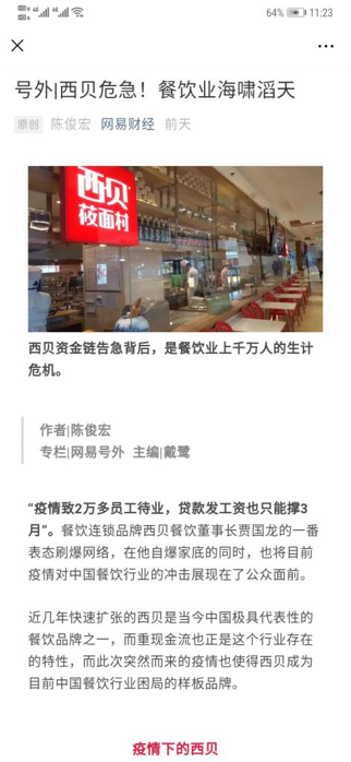 综合来看,新冠疫情将从生产端、需求端两个方面影响经济,对服务业已形成较大冲击。餐饮住宿、旅游文娱等行业的经营收入疫期锐减,甚至几近于无。连西贝这样的行业佼佼者都面临着如此巨大的资金压力,可想而知那些发展期的中小微企业们,只怕更加难熬。