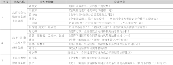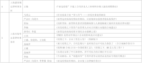 上海市严嫣律师事务所的严嫣律师向长宁政协提交了《建议长宁区出台支持中小企业共度疫情难关的几条建议》、《建议长宁区及时肯定、表彰抗击疫情一线的各级各战线人员的建议》2份提案以及《建议北上广大型城市提前准备小汤山型定点医院防范应对疫情爆发 》、《疫情之下,建议推动远程或者网上在线开庭》、《关于全国统一延期开学并顺延考试的建议》、《关于对抗击疫情有特殊贡献人员的奖励措施的建议》4份社情民意报告。上海市海华永泰律师事务所严洁红律师撰写了《适当延长春节假期、延迟复工及开学时间,有效控制病毒蔓延的建议》、《关于进一步加强我市疫情防控措施的建议》、《关于全力保障企业恢复生产的建议》、《关于复工期后严控返沪人员对本市疫情影响的建议》等与疫情防控相关的4篇社情民意。