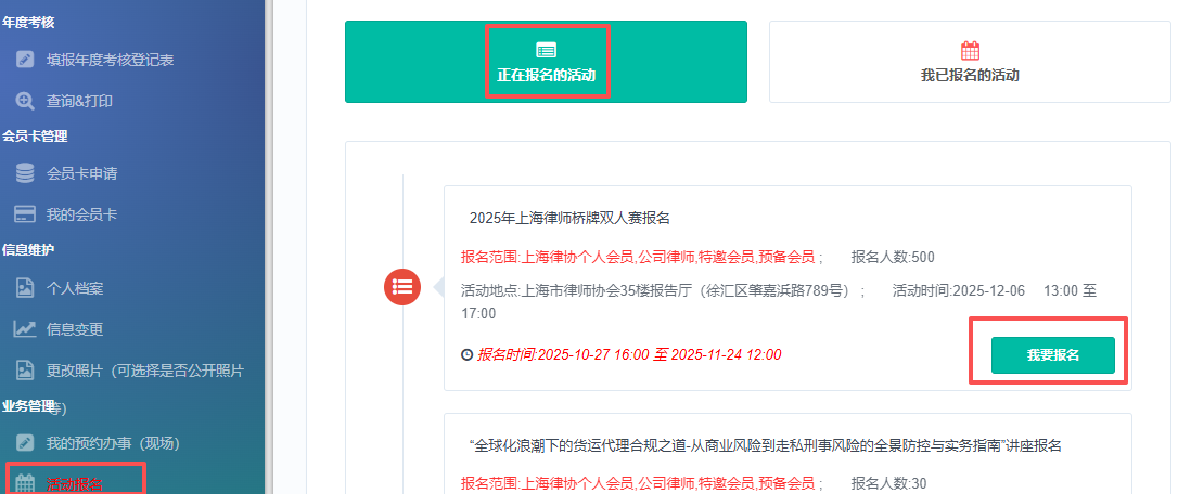 通过个人会员账号登录东方律师网,进入“会员中心”,点击“活动报名”,如下图所示: