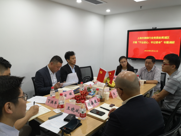 根据上海市律师行业党委“不忘初心、牢记使命”专题调研的总体部署,8月21日,市律师行业党委委员、市律协副会长朱林海带队赴黄浦区、嘉定区开展调研,市律协文体委主任朱黎庭,外事委副主任陈青东、方健等陪同调研。本次调研旨在掌握并解决行业党建和行业发展存在的紧迫问题和突出问题,听取对市律师行业党委委员党建责任区和基层联系点制度的意见和建议。