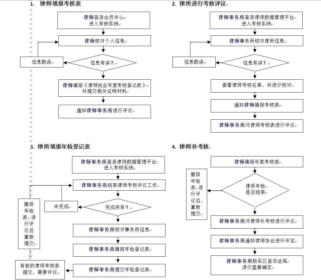 2013年度律师考核系统已于2014年4月1日开通。律师事务所及律师操作流程如下: