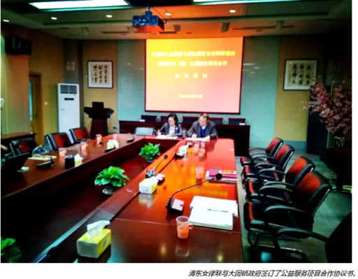 美丽乡村的建设自然离不开依法治国之基本原则。保障村民过有尊严的生活,打造有魅力的乡村环境,保护乡村文化,都需要有法律作为保障,这些法律需求促成了大团镇政府与女律联的公益服务合作项目。在简单的考察后,女律联与大团镇政府举行了关于公益服务合作协议的签约会议。为便于双方沟通,大团镇负责政法工作的朱书记及司法所、各村负责人均参加了本次签约会议。