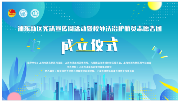值此我国第四个宪法宣传周及“12.5”世界志愿者日到来之际,2021年12月3日,浦东新区宪法宣传周活动暨校外法治护航员志愿者团成立仪式于华东师范大学第二附属中学前滩学校报告厅顺利举行。