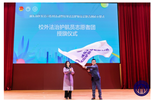 浦东新区团区委书记、区青联主席林廷钧向浦东校外法治护航员志愿者团团长、浦东律师青联会长储小青授志愿者团团旗。