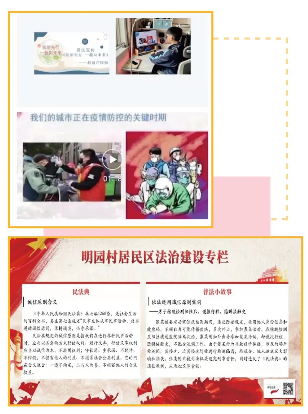 上海贝勤律师事务所赵蓓芹律师作为上海市中原中学的法律顾问,疫情期间她特意为中原中学师生录制了主题为“法治先行,一起向未来”的普法宣传视频,对疫情特殊时期学校、同学和家长的防控职责、法律风险进行解析,呼吁广大家长和同学做好自我防护,配合相关部门做好疫情防控工作。上海四维乐马律师事务所谢东律师、田卫民律师也为平凉路街道居民制作了疫情防控法治专栏,以《民法典》诚信原则为落脚点,讲述“男子核酸检测阳性后,谎报行程,隐瞒接触史”等普法小故事,深入浅出,达到了提高居民防疫意识和遵守防疫规则的良好效果,为科学防疫、依法抗疫提供法律护航。