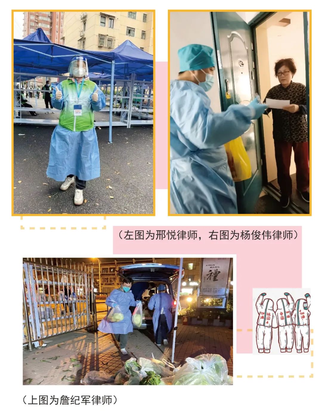 上海市华荣律师事务所邢悦律师于3月21日凌晨第一时间就加入了居委的志愿者群,有人反映居民没收到当天的牛奶或者没收到刚下单的蔬菜,为了解决居民生活物资问题,她第二天一大早便骑着自家的电瓶车给居民们送牛奶。因小区老旧,多户的对讲系统损坏,按了很久没人回应的就爬楼上去再敲门,但还是有敲门之后也无人应答的,只能继续上大喇叭,确保每份牛奶都送到居民手上。随后她还承担了每日为给居民们配送其他生活物资的工作,解决了居民们的燃眉之急。邢悦律师说:“晚上回到家三岁半的儿子跟我说:妈妈,您辛苦了。我想我的行为也在他心里种下了小小的种子,但行好事,莫问前程。”除了邢悦律师,华荣律师事务所杨俊伟律师、詹纪军律师等人也都积极参与所在小区防疫志愿工作,发光发热送温暖。