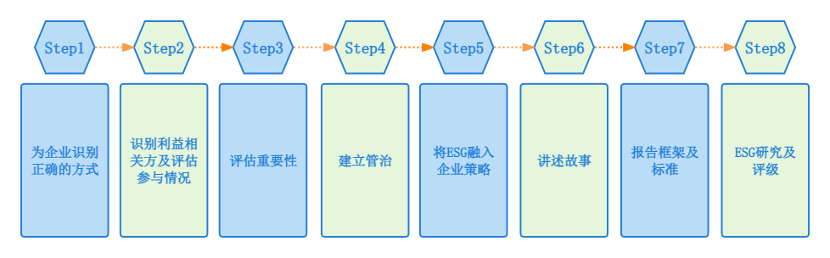 从整体来看,纽交所建议ESG报告分为八个步骤,如下图所示。