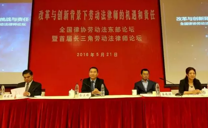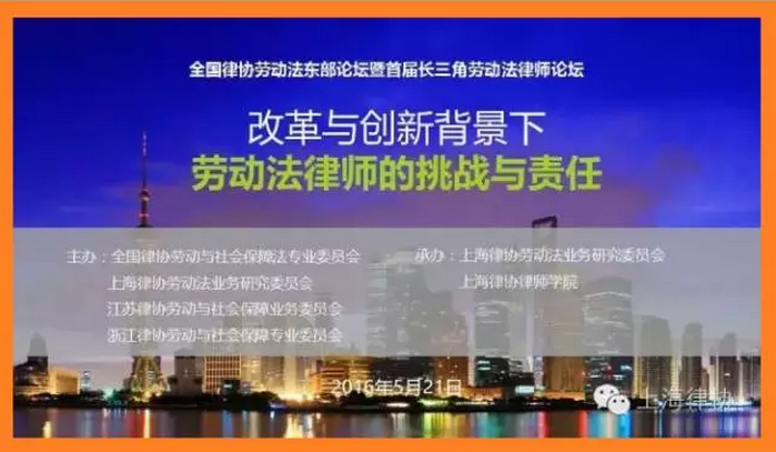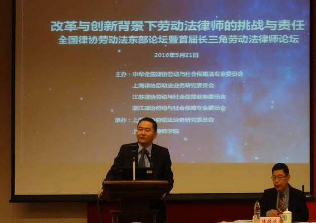 2016年5月21日,全国律协劳动法东部论坛暨首届长三角劳动法律师论坛在上海交大懿德楼2楼报告厅胜利举行。此次论坛由全国律协劳动与社会保障法专业委员会、上海律协劳动法业务研究委员会、江苏律协劳动与社会保障业务委员会及浙江律协劳动与社会保障专业委员会主办(以下均简称为“劳委”),上海律协劳动法业务研究委员会、上海律协律师学院承办,以“改革与创新背景下劳动法律师的挑战与责任”为主题,围绕“互联网+”劳动法,大众创业、万众创新与劳动法律师业务,以及经济下行、供给侧改革与劳动法律师业务三个议题召开。上海律协会长俞卫锋、中国社会法学会副会长姜俊禄、全国律协劳专委主任王建平、上海律协副会长邹甫文,以及湖南省人社厅、上海市人社局、上海市高院、上海市劳动仲裁院、上海市二中院、上海市总工会的领导和专家应邀出席。来自全国各地的200余名劳动法专业律师参与本此论坛。群贤毕至,劳动法精英汇聚一堂。