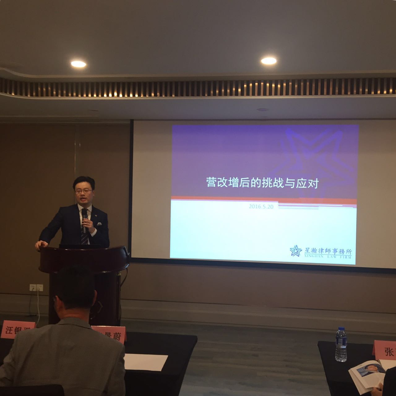 论坛第一部分为财税方面的专家,星瀚律师事务所杨晖为大家介绍《营改增的政策》。他详述了营改增后的税率和征收率、应纳税额的计算、纳税时间和纳税地点、税收减免政策等企业关注的问题,并就跨境应税、房产公司业务、租赁业务等细节深入展开。