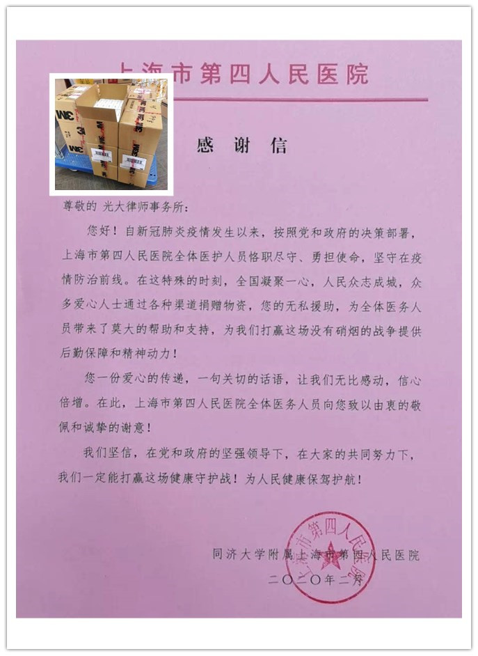 虹口律师驰援一线医护人员,无私奉献,精诚团结,捐款捐物的做法得到了疫情一线的肯定和认可。上海市第四人民医院向上海市光大律师事务所发来感谢信,感谢其捐赠了一批3M人工皮敷料,使医护人员避免了因长时间佩戴口罩、护目镜后引发的面部压疮。